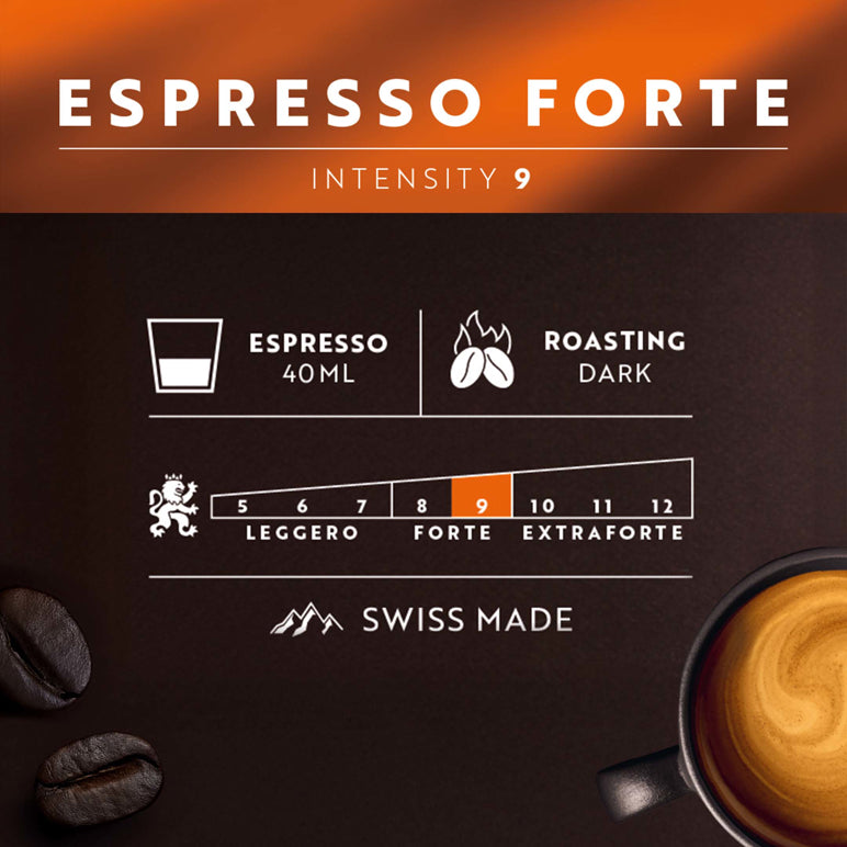 Café Royal Espresso Forte is a full-bodied coffee with a hint of dark chocolate, accompanied by fruity aromas.